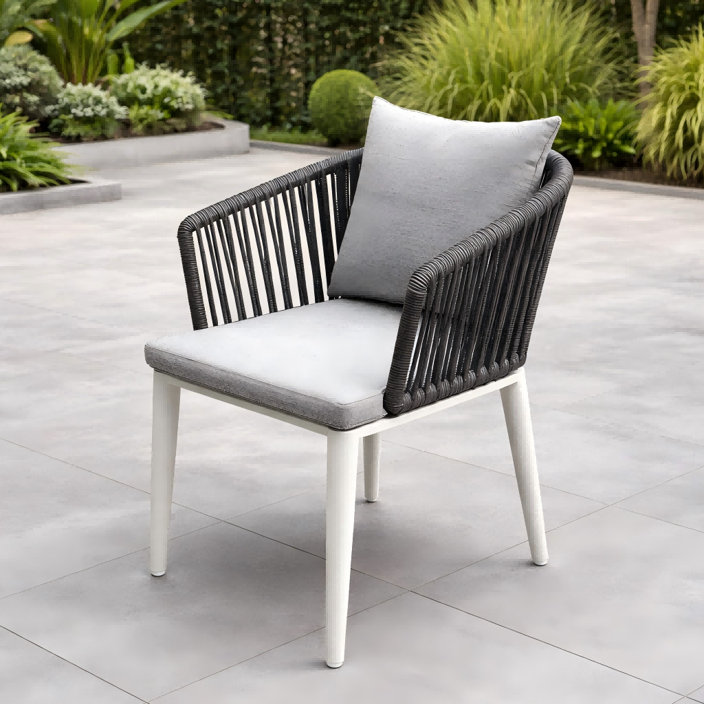 Трпезаријске столице имају наслон ткани од ужади, стварајући модеран и елегантан изглед, истовремено пружајући удобну подршку. Оквир је направљен од алуминијума обложеног прахом, који нуди одличну отпорност на рђу и вањске временске услове.